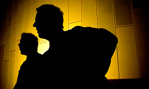 The cladding itself has a yellow colour and so I decided to place a Lumedyne flash unit directly behind the seat that they were sitting on. It was very close to the wall, which give far steeper fall off of the light and a more dramatic outline. I find that the best place to focus for a silhouette is on the edge of the subject rather than the normal eye or face. I was shooting with a 16-35 f2.8L lens on a Canon EOS1D MkII at the wide end of the scale and the exposure here was 1/250th at f9.5. The flash was dialed down to 1/8th power and at that aperture I had easily enough depth of field to get the brothers both sharp and to have easily enough detail in the background.