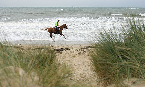 Of course photographers rarely get to choose the weather and it was raining with a reasonably strong wind. The tide was just right (we checked the tables in advance) and so we started to shoot some pictures of her riding on the sand. It’s a stretch of coast that I know well and I knew that there was a high chance of poor weather. There’s nothing that you can do when the deadline is tight except to shoot the best pictures that you can.