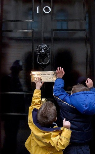 Children from a Leicestershire nursery school try to hand in their petition against closure to No.10 Downing Street.