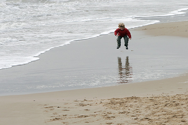 This photograph of a child playing on the beach in the winter suggests that he is really enjoying his freedom. The photograph was taken from quite a height (maybe 25 feet) to isolate the sand from the confusing background and the fact that he is nearer the right of the frame suggests that he has a lot more room to head into. The oldest rule about composition – the rule of thirds – is being observed.