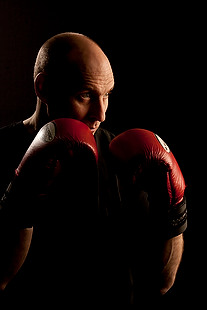 Shot one was of one of the owners who uses boxing and boxing training to work with many of his clients and with some of the group classes he teaches. We went for a simple composition with him putting up his guard as if the 24”x36” soft box that was about four feet away from him was his opponent. That gave us the main light and I used a second head with a grid diffuser behind him to accentuate the shape of his shoulders, neck and head. The first few shots featured black boxing gloves but that was just one bit of black too far and so we swapped them for red and the resulting images were very pleasing.