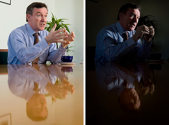 The idea here is to have two separate lighting set-ups for one interview portrait without having to constantly move around the room adjusting lights. This interview was with a senior businessman who chairs a body that decides how much teachers’ pay rises will be each year. The reporter wasn’t all that comfortable with me shooting through the interview but it was what the picture editor wanted, so that’s what I did. This job required a bit of quick thinking so that I could get two different set-ups in place.