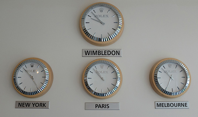 NT1_2737 ← Previous Next → Rolex clocks in the AELTC reception showing the correct time at each of the Grand Slam tennis tournaments. The Championships 2016 at The All England Lawn Tennis Club, Wimbledon. Day 4 Thursday 30/07/2016. AELTC/Neil Turner
