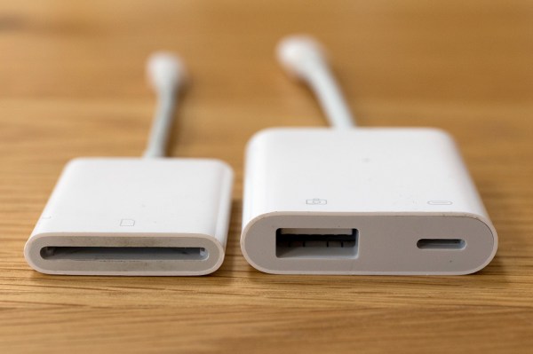 - Plugging either an SD or Compact Flash card into the Apple adapter via a card reader using an external power supply