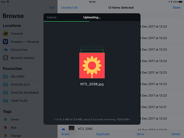 The way that FTP from the Transmit app works for me is simple. I locate the pictures in Files, select them and use the share option to select the Transmit app. In Transmit I select the FTP server that I wish to send the pictures to and then touch “Upload”. If there are any duplicate issues or if there are any other problems you get a notification but otherwise you just let the app do its job.