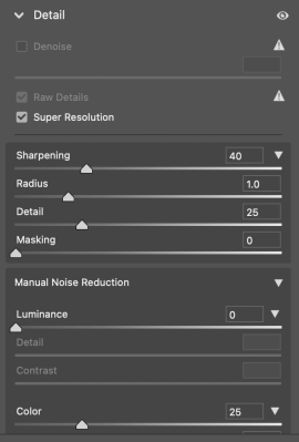 - Super resolution. A simple checkbox allows you to effectively double the length of the image along the longest side. For example, Canon R6 MkII files which are 6,000 x 4,000 pixels out of the camera become 12,000 x 8,000 pixels and the quality is surprisingly good, especially with lower ISO photographs. It’s not often that I need to upsize files to this extent but now it’s really easy. I have been using the option to upsize images in the Save dialogue box (since I discovered it many, many years ago) but this is more convenient and in side by side tests marginally higher quality.