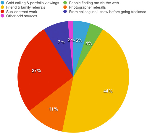 If I had the time, I’d like to work out how different the chart would be if I based the figures on the amount of time spent on the jobs rather than the money invoiced. My strong suspicion is that the cold calling and portfolio section would be a fair bit bigger as would the one for pre-freelancing colleagues because those are both news and editorial biased sections whereas the friends and family one is far more corporate and commercial.