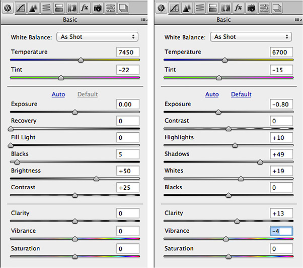 Adobe Camera RAW adjustments palettes from CS5 (ACR6) on the left and CS6 beta (ACR7) on the right.